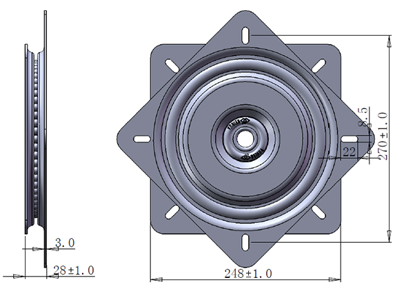 Поворотная пластина 250 * 250 мм, толщина составляет 3,0 мм. Обработка поверхности черное порошковое покрытие. 360 градусов свободного вращения. Большой центр дизайн диаметра заклепки, двойной дизайн подшипника, сильная грузоподъемность. Он подходит для использования для барстата, офисного стула и столового стула и т. Д.
